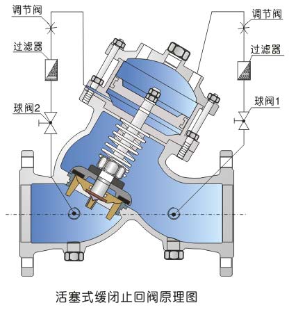 YQ98004过滤活塞式止回阀安装在高层建筑、消防给水系统以及其它给水系统的管道上。当水泵开启时,水通过导管进入中腔,推动活塞上升,主阀开关。当水泵停止工作时,活塞在回水压力下降,由于进口处针形阀比出口球阀流量小,因此活塞缓慢下降,主阀也随之缓慢关闭。本公司生产YQ98004过滤活塞式止回阀平稳可靠,消除压力余波。过滤活塞式止回阀主要零件材质如下表: ![]()